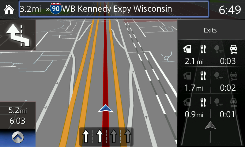 Depending on whether you are navigating an active route or driving without a destination, the fields displayed may include speed limit of the current road, distance to be traveled before reaching destination, estimated arrival time and when available, live traffic information or historical traffic data.